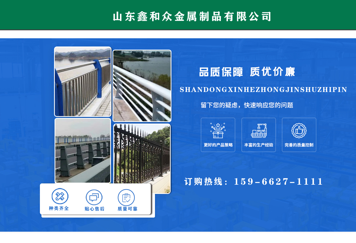 山東鑫和眾金屬制品有限公司主要產(chǎn)品有防撞護(hù)欄,橋梁護(hù)欄,道路護(hù)欄,河道護(hù)欄,不銹鋼護(hù)欄等護(hù)欄。提供設(shè)計方案,一站式定制,包您滿意價格優(yōu)惠,歡迎來電咨詢!    公司常年從事銷售護(hù)欄防撞護(hù)欄,橋梁護(hù)欄,道路護(hù)欄,河道護(hù)欄,不銹鋼護(hù)欄,橋梁鋼護(hù)欄,河道燈光護(hù)欄等。產(chǎn)品廣泛應(yīng)用于橋梁、河道、旅游景區(qū)、道路、公路、公園、小區(qū)、景觀、道路防撞等領(lǐng)域?!   」井a(chǎn)品均采用優(yōu)質(zhì)不銹鋼材料,符合相關(guān)標(biāo)準(zhǔn)。各種型號不銹鋼復(fù)合管及護(hù)欄,質(zhì)量嚴(yán)格把控。產(chǎn)品強(qiáng)度高、耐腐蝕、焊接牢固、抗沖擊、性能好,防撞護(hù)欄結(jié)構(gòu)簡單、美觀實(shí)用大方?!    g迎前來訂購!...